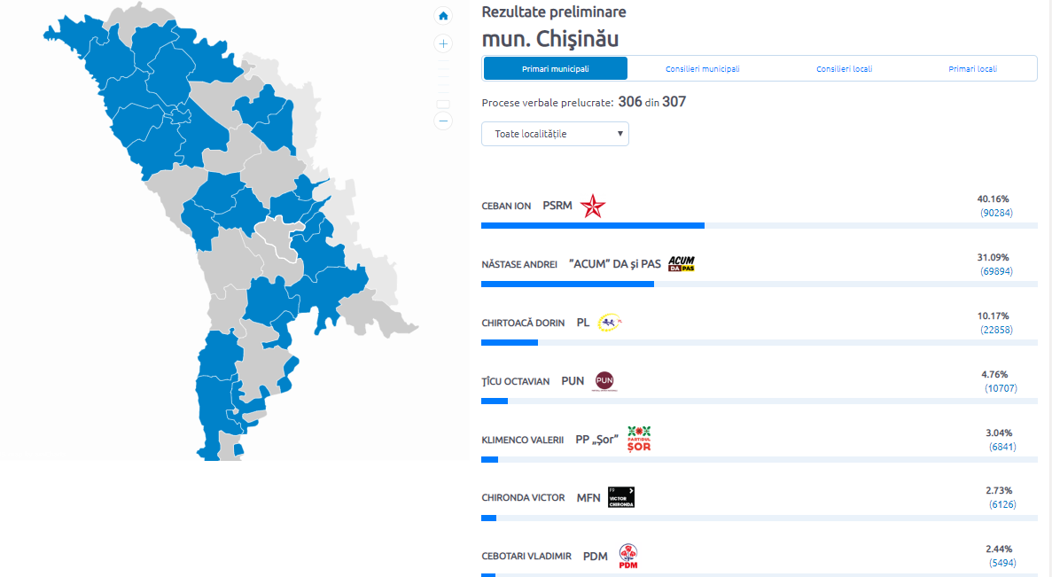 Alegerile locale pentru funcția de primar al capitalei vor continua și în turul doi. Potrivit rezultatelor preliminare oferite de CEC, până în acest moment au fost procesate 306 procese dintr-un total de 307.