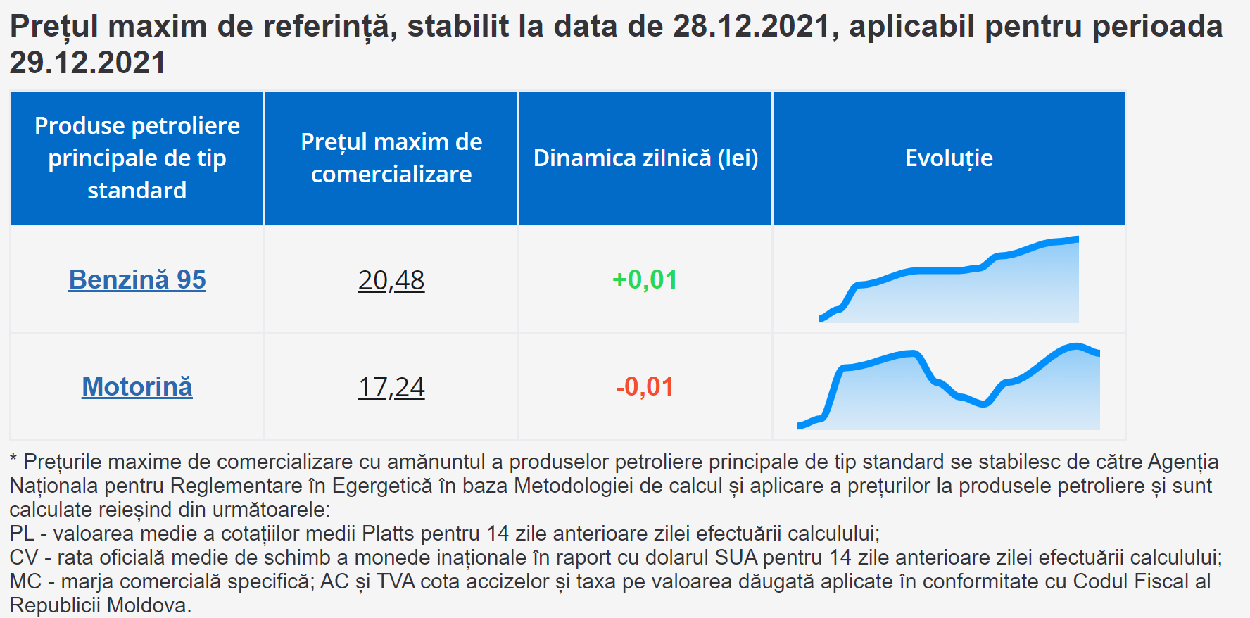 Agenția Națională pentru Reglementare în Energetică (ANRE) a anunțat marți, 28 decembrie, noile prețuri maxime de comercializare pentru litrul de motorină și benzină în Republica Moldova.