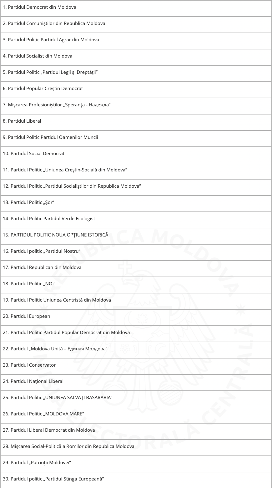 Astfel, următoarele 53 de formațiuni politice pot să-și înainteze candidați la funcția de deputat în Parlamentul Republicii Moldova: