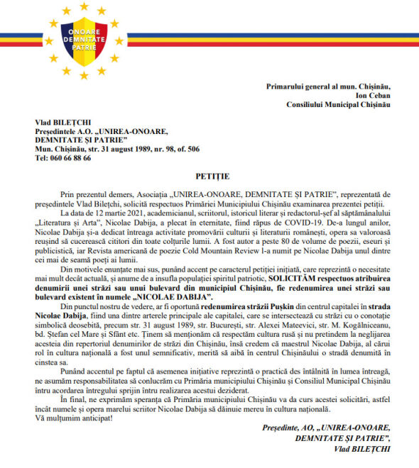 Unioniștii solicită redenumirea străzii Pușkin din centrul capitalei în cinstea lui Nicolae Dabija. O petiție corespunzătoare a fost depusă de liderul Unirea-ODIP, Vlad Bilețchi, la Primăria mun. Chișinău.