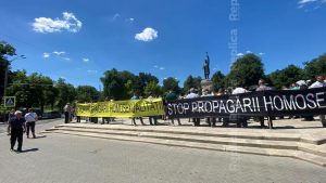 Zeci de oameni s-au adunat în fața monumentului lui Ștefan cel Mare pentru a protesta împotriva promovării homosexualității. Aceștia au venit cu pancarte anti-LGBT.