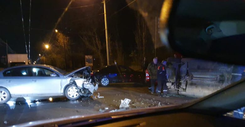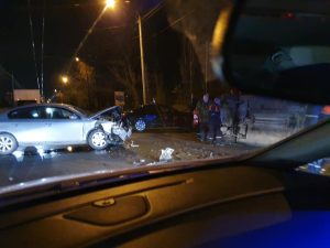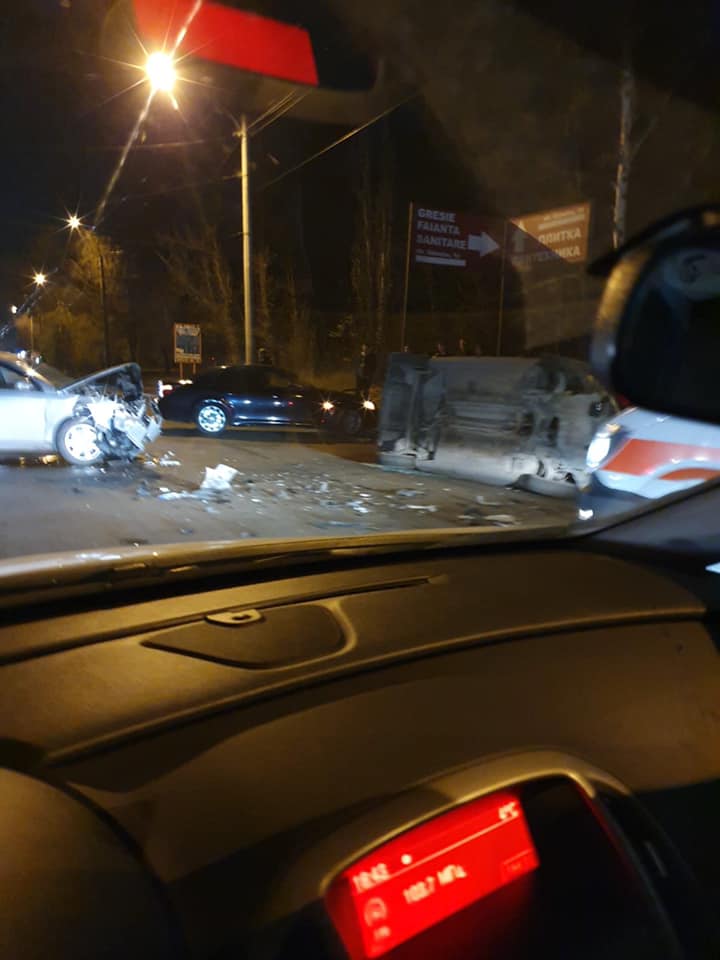 Două automobile s-au tamponat violent aseară pe strada Uzinelor din capitală. În urma impactului, unul dintre vehicule s-a răsturnat.