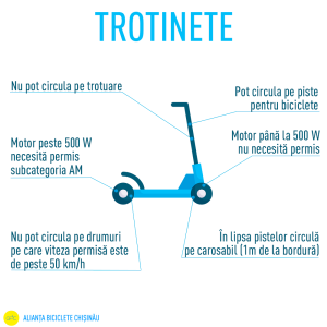 Trotinetele sunt reglementate. Conducătorii trotinetelor nu vor mai putea circula pe trotuar, ci doar pe pista pentru cicliști, iar în absența ei, pe carosabil, pe partea dreaptă, la maximum 1 m distanță de la bordură.