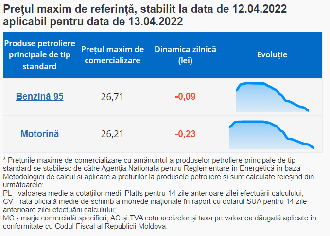 Precizăm că Parlamentul a decis că ANRE va stabili prețurile maxime de comercializare cu amănuntul a produselor petroliere principale de tip standard în fiecare zi lucrătoare. Acestea vor fi valabile cu începere de la ora 00:01 pentru ziua/zilele următoare celei/celora în care au fost stabilite.