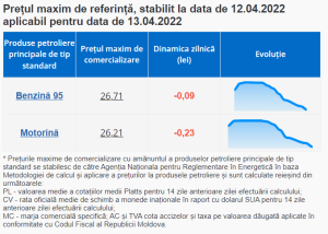 Agenția Națională pentru Reglementare în Energetică (ANRE) a anunțat marți, 12 aprilie, noile prețuri maxime de comercializare pentru litrul de motorină și benzină în Republica Moldova ce vor intra în vigoare de miercuri, 13 aprilie.