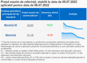 Agenția Națională pentru Reglementare în Energetică (ANRE) a anunțat marți, 5 iulie, prețuri maxime de comercializare pentru litrul de motorină și benzină în Republica Moldova ce vor intra în vigoare de miercuri, 6 iulie.