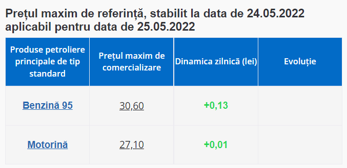 Precizăm că Parlamentul a decis că ANRE va stabili prețurile maxime de comercializare cu amănuntul a produselor petroliere principale de tip standard în fiecare zi lucrătoare. Acestea vor fi valabile cu începere de la ora 00:01 pentru ziua/zilele următoare celei/celora în care au fost stabilite.