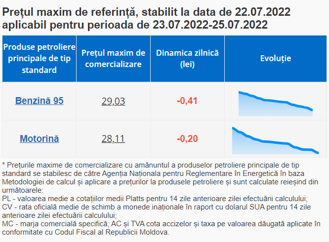 Precizăm că Parlamentul a decis că ANRE va stabili prețurile maxime de comercializare cu amănuntul a produselor petroliere principale de tip standard în fiecare zi lucrătoare. Acestea vor fi valabile cu începere de la ora 00:01 pentru ziua/zilele următoare celei/celora în care au fost stabilite.
