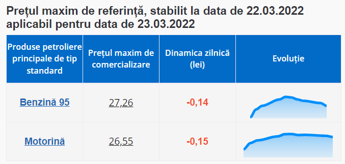 Astfel, benzina A95 va costa mâine cel mult 27 de lei și 26 de bani per litru (cu 14 bani mai puțin decât azi). Motorina se ieftinește și ea cu 15 bani și va avea un preț maxim de 26 de lei și 55 de bani per litru.