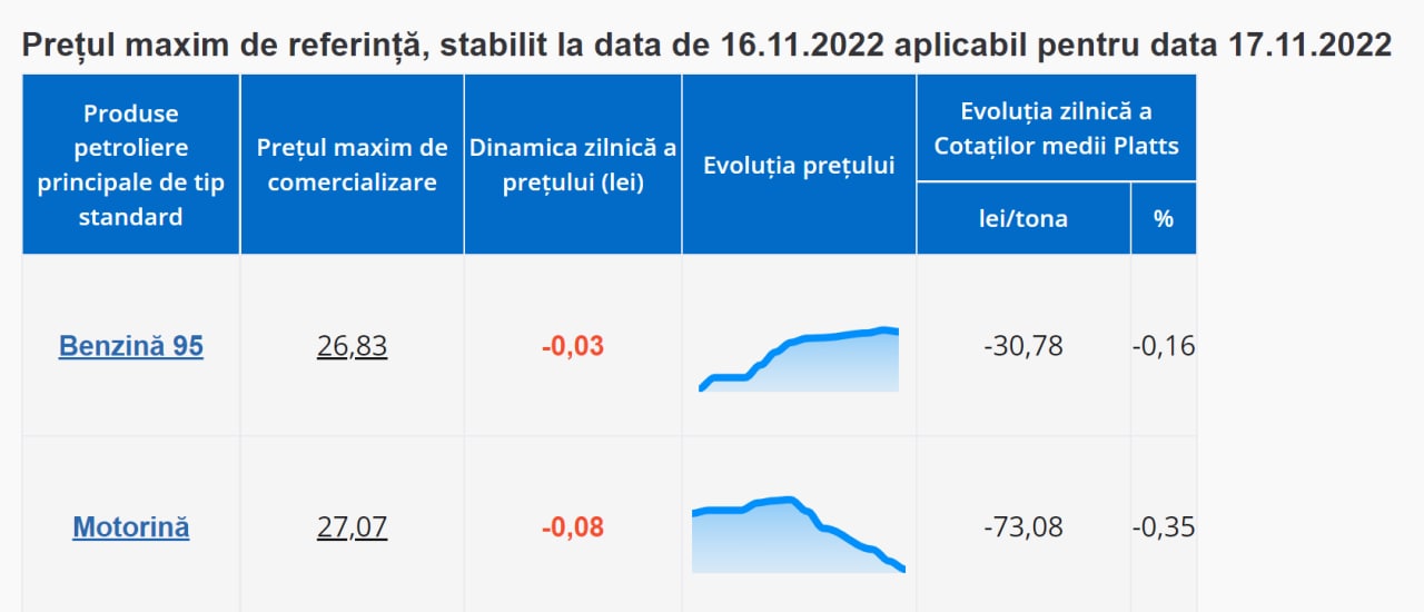 Astfel, benzina A95 va costa în următoarea zi cel mult 26 de lei și 83 de bani per litru (cu 3 bani mai puțin decât azi). Motorina se ieftinește cu 8 bani și va avea un preț maxim de 27 de lei și 7 bani per litru.