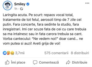„Fără concerte, fără ședințe la studio, fără înregistrări. Îmi cer scuze față de cei cu care trebuia să mă întâlnesc sau în fața cărora trebuia să cânt. Vorba cântecului: Ne vedem noi, doar când… ne vom putea și auzi. Aveți grijă de voi!”, transmite artistul.