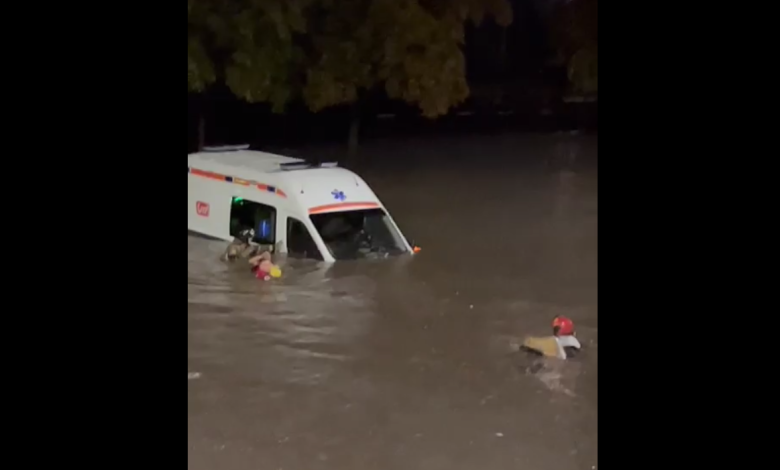 video | Imagini de groază pe strada Albișoara: O ambulanță cu o gravidă în interior a fost înghițită de ape