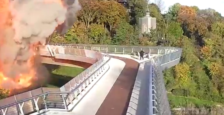O rachetă rusească a lovit în dimineața zilei de luni, 10 octombrie, podul pietonal din Kiev. Momentul a fost surprins…