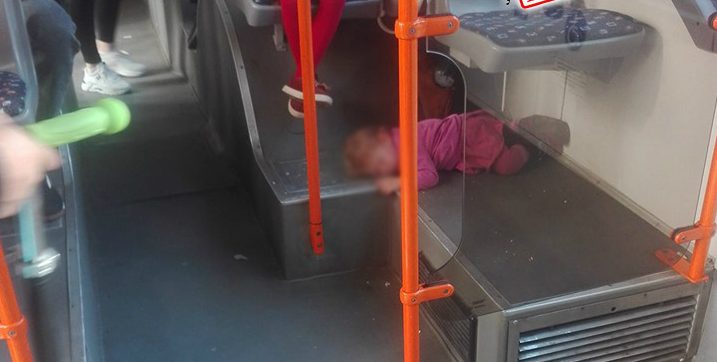 O copilă care ar avea doar câțiva anișori a fost surprinsă cum stă culcată pe podeaua unui troleibuz de pe…
