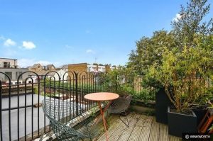 Parterul, unde fostul magazin a fost transformat într-o intrare, şi primul etaj sunt de dimensiuni similare. Între o cameră şi un birou se află o terasă cu o vedere uluitoare spre acoperişurile din vestul londonez.