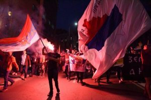 Protestatarii au scandat „Fără NATO” şi „Sârbii şi ruşii sunt fraţi”, precum şi sloganuri împotriva preşedintelui Aleksandar Vucic care a câştigat votul prezidenţial pe 3 aprilie, în timp ce progresiştii săi au asigurat cele mai multe voturi pentru a forma un guvern.