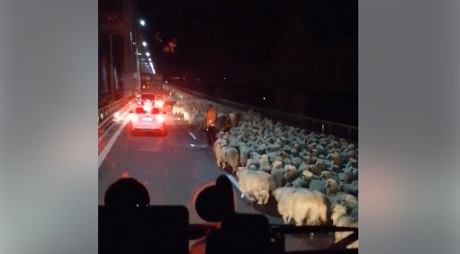 În spatele camerei șoferul se plânge că nu vede poliția, care ar putea amenda ciobanii. Acesta menționează că e autostradă de mare viteză, „pentru ovine, nu pentru noi” și că este nevoit să se deplaseze cu 10-15 km/h.