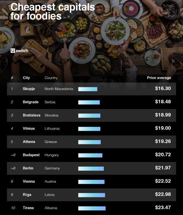 De asemenea, este a doua cea mai ieftină capitală la mâncare, la un preţ mediu de numai 15,98 euro pentru o masă, aproape jumătate din preţul mediu pentru Bucureşti (32,52 euro).