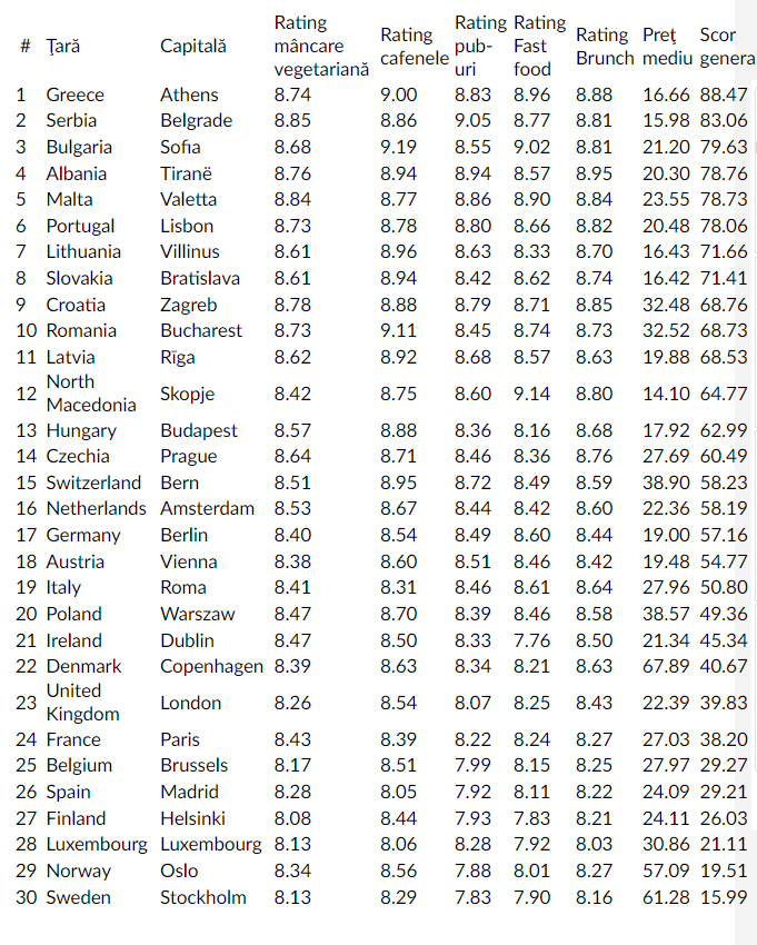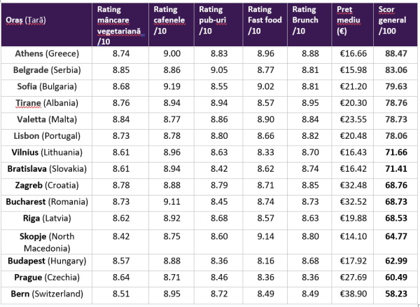 În acest index, s-au analizat numărul de restaurante cu patru stele sau mai mult din fiecare oraş, preţul mediu al unei mese şi evaluarea medie pentru fast-food, cafenele, pub-uri şi restaurante vegetariene din fiecare zonă. Au reuşit să preia aceşti factori şi să realizeze un scor general înainte de a descoperi cele mai bune capitale pentru iubitorii de mâncare.