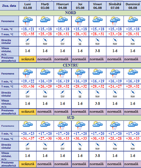 La centrul țării minimele vor fi de +24 de grade ziua, iar maximele vor ajunge la +36 de grade Celsius. Noapte mercurul din termometre nu scade sub +16 grade, iar precipitații cu descărcări electrice sunt prognozate pentru luni, miercuri, joi și sâmbătă.
