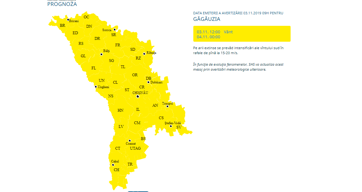 Conform Serviciului Hidrometeorologic de Stat, în intervalul orelor 12:00 – 00:00, pe arii extinse se prevăd intensificări ale vântului în rafale de până la 15-20 m/s.