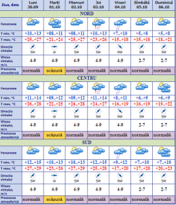 Potrivit meteorologilor, la nord vor fi între +15 și +27 de grade ziua. Temperaturile nocturne vor varia de la +5 până la +13 grade Celsius. Joi și vineri ar putea ploua.
