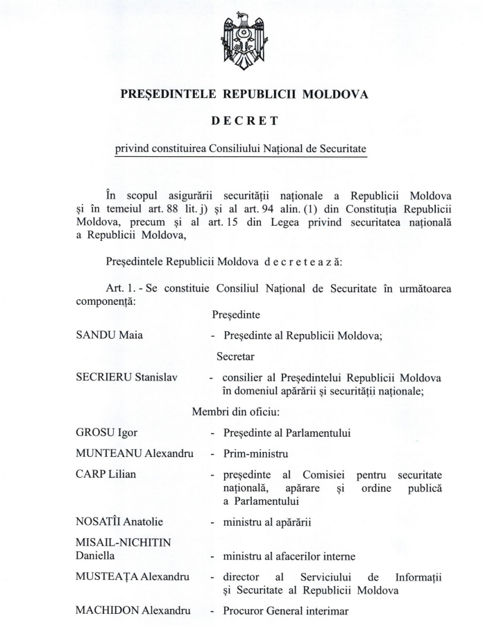 doc | Maia Sandu a semnat decretul de creare a Consiliului Național de Securitate. Cine sunt membrii