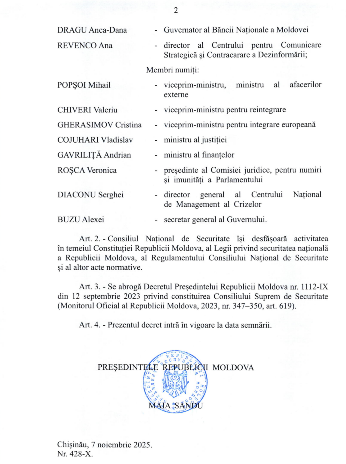 Șefa statului a semnat vineri, 7 noiembrie, decretul de creare a noului Consiliu Național de Securitate (CNS), un organ consultativ pe lângă președinte, responsabil de coordonarea și monitorizarea politicilor de securitate națională.