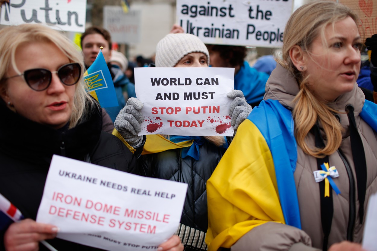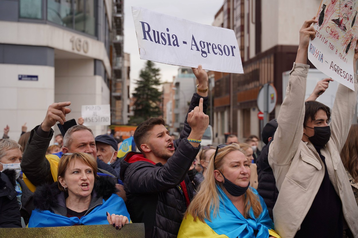 „Rusia, jos labele de pe Ucraina” şi „Putin este un asasin” au fost sloganurile ce au putut fi auzite. „Opriţi acum Rusia”, „Opriţi războiul”, „Ajutaţi acum Ucraina”, strigau participanţii.