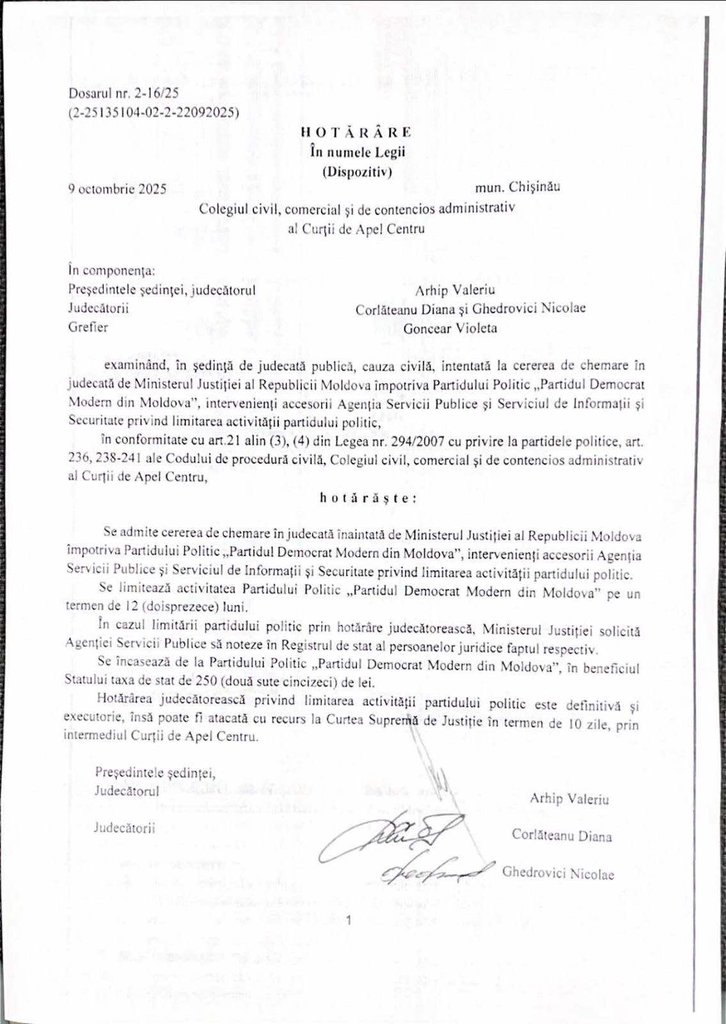 Curtea de Apel Centru din Chișinău a admis integral acțiunea înaintată de Ministerul Justiției al Republicii Moldova împotriva Partidului Democrat Modern din Moldova, dispunând limitarea activității formațiunii pentru o perioadă de 12 luni.