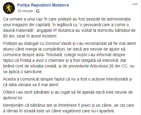 Cazul a avut loc aseară, iar potrivit magazinului, nu ar fi pentru prima dată când bărbatul de 81 de ani ar proceda astfel. De această dată, dauna cauzată magazinului ar fi de circa 15 lei. În același timp, martorii care au văzut informații despre acest caz pe rețelele de socializare spun că bătrânul are acasă câteva animale pentru care cumpără regulat cea mai ieftină hrană și s-au mobilizat să îl ajute și să doneze produse pentru el și patrupezi.