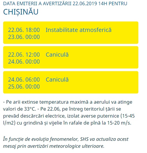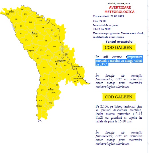 Potrivit meteorologilor, pe alocuri vor cădea preipitații în volum de15-45 l/m2, iar rafalele de vânt ar putea ajunge la o viteză de 15-20 m/s. În același timp, Codul galben de caniculă a fost prelungit până pe 25 iunie, ora 00:00. Astfel, temperatura maximă a aerului în această perioadă ar putea ajunge la +33 grade Celsius.