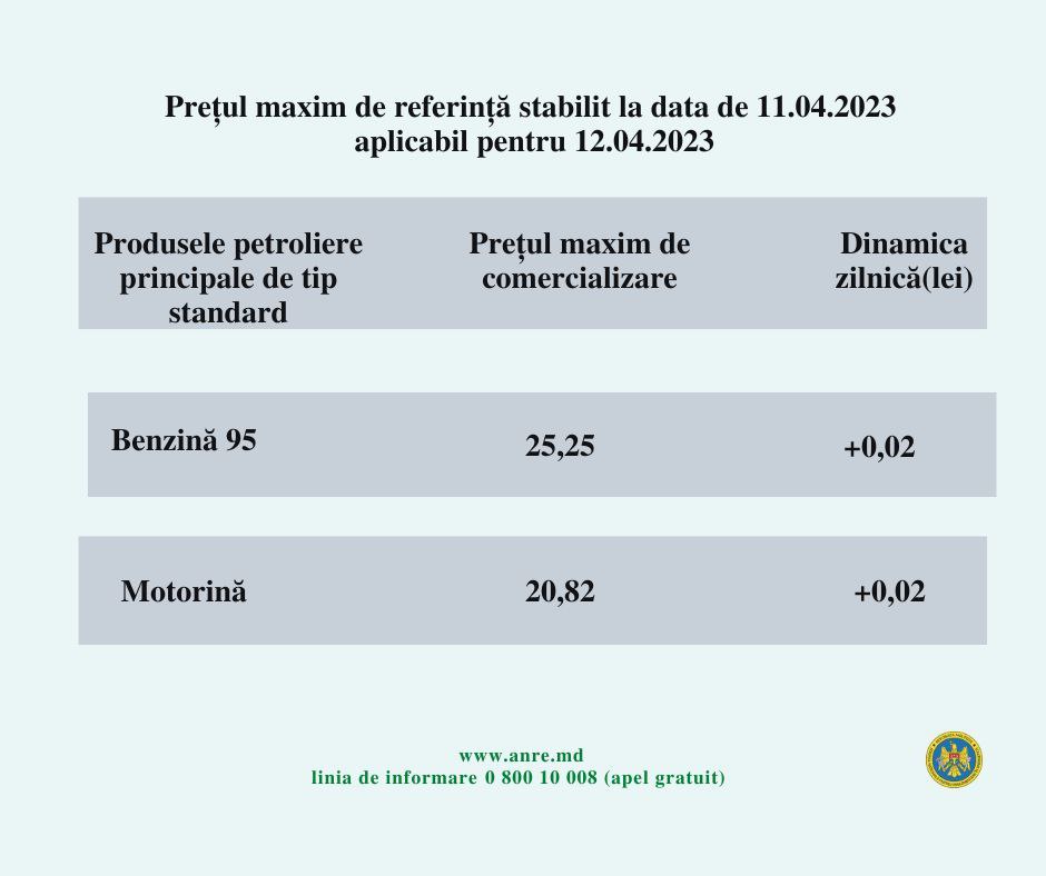 Agenția Națională pentru Reglementare în Energetică (ANRE) a anunțat marți, 11 aprilie, prețuri maxime de comercializare pentru litrul de motorină și benzină în Republica Moldova valabile pentru mâine, 12 aprilie.