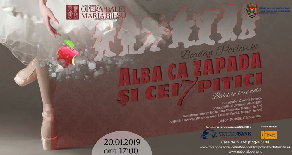 17:00. Alba ca Zăpada și cei șapte pitici. Vino la un spectacol de balet pentru a te inspira și a-ți liniști sufletul, la Teatrul Naţional de Operă şi Balet. Frumusețea artistică îți va fi prezentată în coregrafia lui Ghenrih Maiorov.