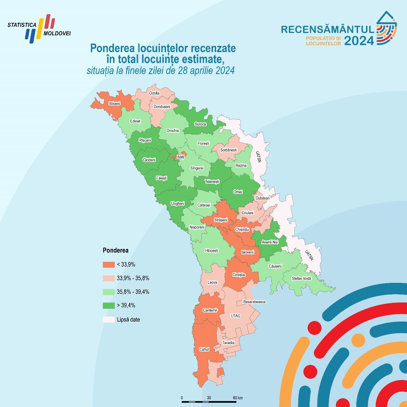 BNS prezintă informația privind ponderea locuințelor recenzate în total locuințe estimate, în profil teritorial, la finele zilei de 28 aprilie 2024.