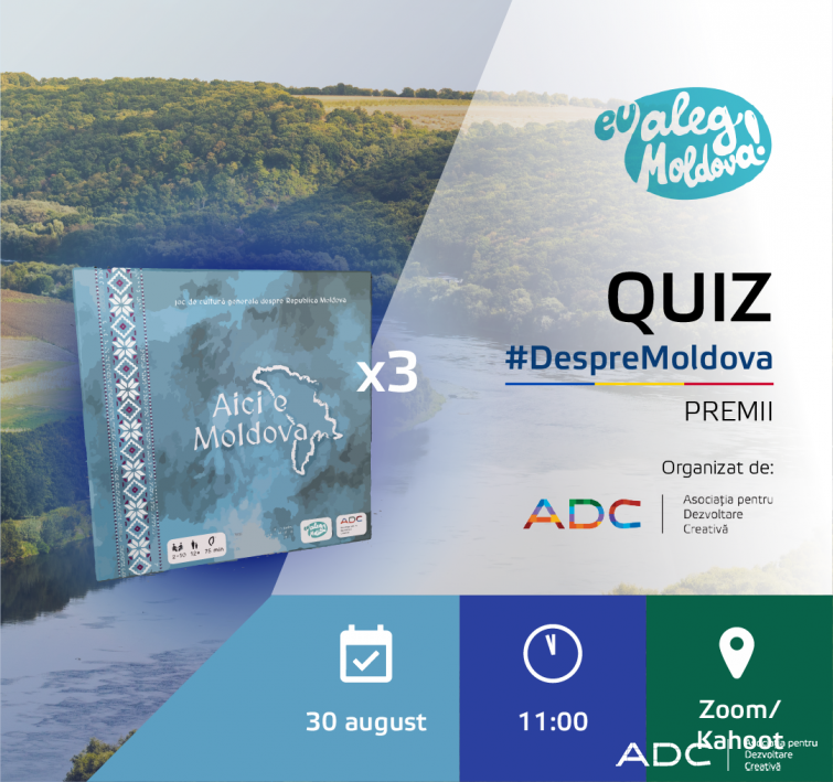 A fi cetățean al Republicii Moldova înseamnă a-ți cunoaște originile și istoria neamului tău, a ști și a respecta obiceiurile țării, a redescoperi țara în fiecare zi și a-ți împărtăși cunoștințele cu restul lumii. Asociația pentru Dezvoltare Creativă (ADC) te invită să-ți multiplici cunoștințele #despreMoldova, în cadrul unui quiz marca „eu aleg Moldova”.