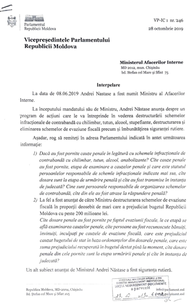 În context, el i-a adresat o interpelare oficială, pentru a afla pașii concreți pe care i-a făcut în vederea destructurării schemelor de contrabandă cu chihlimbar, tutun, alcool, stupefiante; destructurarea şi eliminaгea schemeloг de evaziune fiscală, precum şi îmbunătățirea siguranței rutiere.