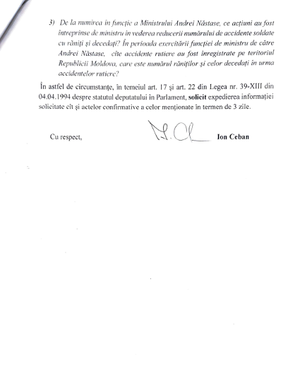 Acesta vrea să știe dacă au fost pornite cauze penale şi care este statutul persoanelor responsabile de aceste scheme. De asemenea, Ceban îi cere lui Năstase să informeze care au fost acţiunile Ministerului pentru recuperarea pagubelor de sute de milioane și ce plan are privind reducerea numărului de accidente rutiere.