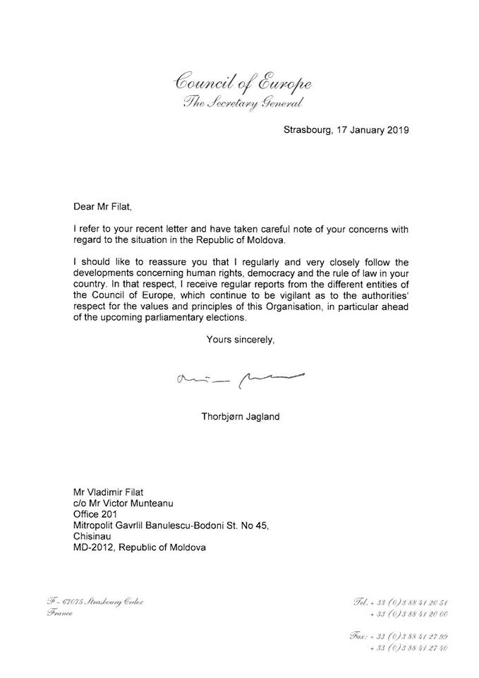 De asemenea, la 17 ianuarie 2019, Secretarul General al Consiliului Europei Thorbjørn Jagland i-a răspuns fostului Prim-ministru și i-a dat asigurări că a luat notă cu mare atenție despre preocupările cu privire la situația din Republica Moldova.
