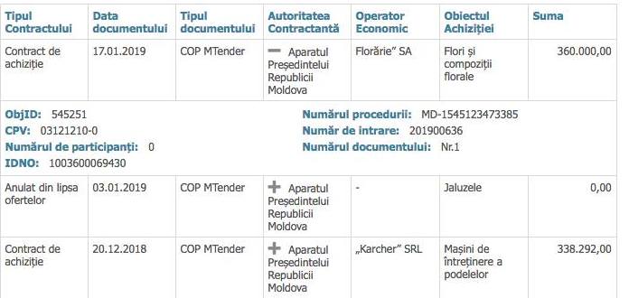 La începutul lui 2018, Aparatul Președintelui a încheiat un contract cu aceeași firmă pentru a cumpăra flori și aranjamente florale, scrie zdg.md. Suma acestuia era de 200.000 de lei. La începutul lui 2017, Președinția cumpăra aranjamente florale de 150.000 de lei.