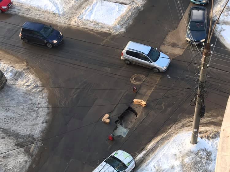foto | „Cursă cu obstacole” pe o stradă din sectorul Buiucani. O groapă imensă s-a format în mijlocul drumului, după ce asfaltul s-a surpat