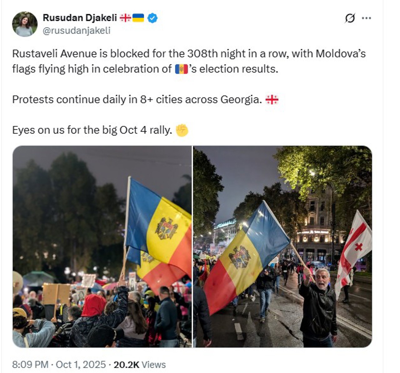 Creatoarea de conținut Rusudan Djakeli a postat câteva imagini pe 2 octombrie, în cea de-a 309-a zi de proteste, însoțite de descrierea: „Tensiunile cresc înainte de 4 octombrie, pe fondul amenințărilor guvernului cu represalii brutale”.