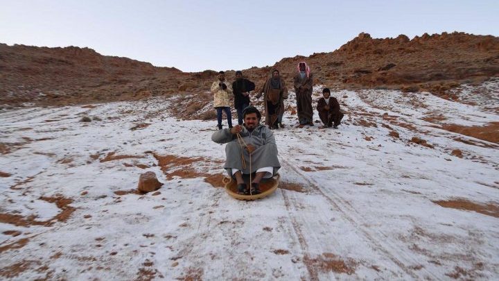 Au parte doar de soare și temperaturi generoase pe tot parcursul anului, dar asta nu a fost un impediment pentru a se bucura de săniuș. Asta pentru că locuitorii din nordul Arabiei Saudite s-au trezit cu câțiva centimetri de zăpadă care s-a așternut peste nisip, oferindu-le astfel posibilitatea să simtă un pic de iarnă în timpul verii.