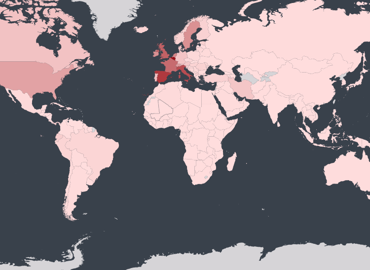 Începând cu 20 aprilie și până acum, 214 teritorii și țări recunoscute de Organizația Națiunilor Unite au raportat cel puțin un caz de infecție cu noul tip de coronavirus.