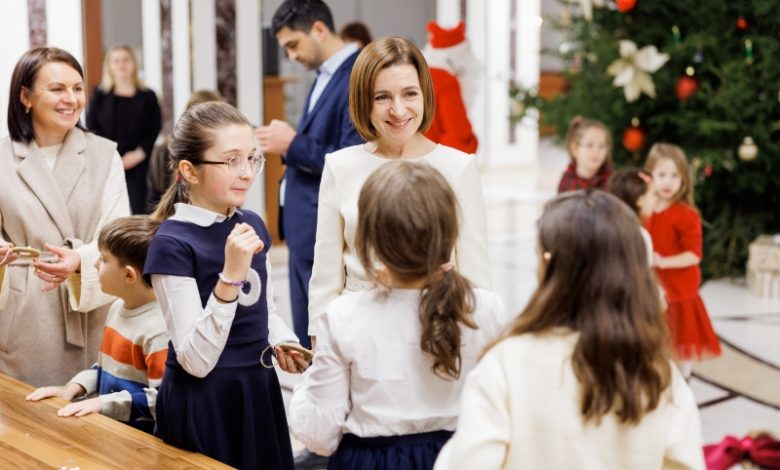 Președinta Maia Sandu, împreună cu angajații administrației prezidențiale și copiii acestora, a participat la aprinderea luminițelor Pomului de Crăciun de la Președinție.