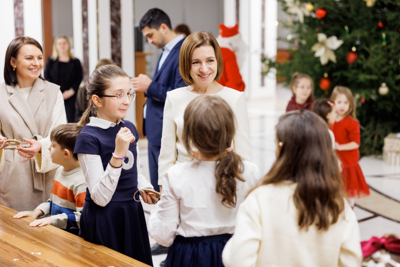 Președinta Maia Sandu, împreună cu angajații administrației prezidențiale și copiii acestora, a participat la aprinderea luminițelor Pomului de Crăciun de la Președinție.
