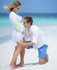 În imagine sportivul îngenunchează în fața ei pe o plajă și îi sărută burtica proeminentă. El a adăugat o descriere fotografiei, menționând că în curând va mai avea un suporter în echipă.