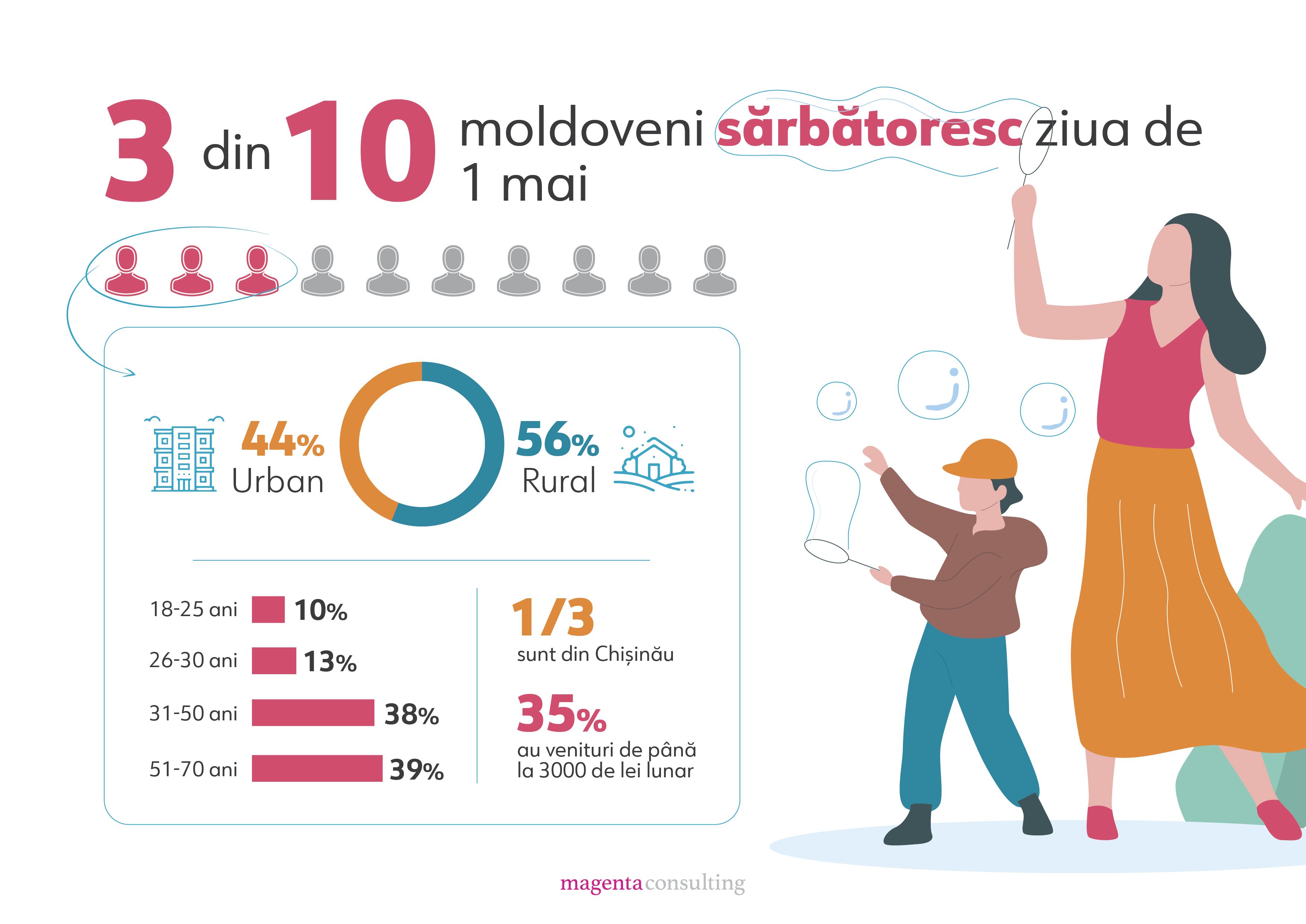 Deși 1 mai este oficial declarată zi liberă, moldovenii nu prea sărbătoresc Ziua Muncii, însă profită de o 24 de ore în plus de odihnă. Doar 3 din 10 moldoveni spun că petrec astăzi, în timp ce 70% afirmă că nu fac nimic deosebit.