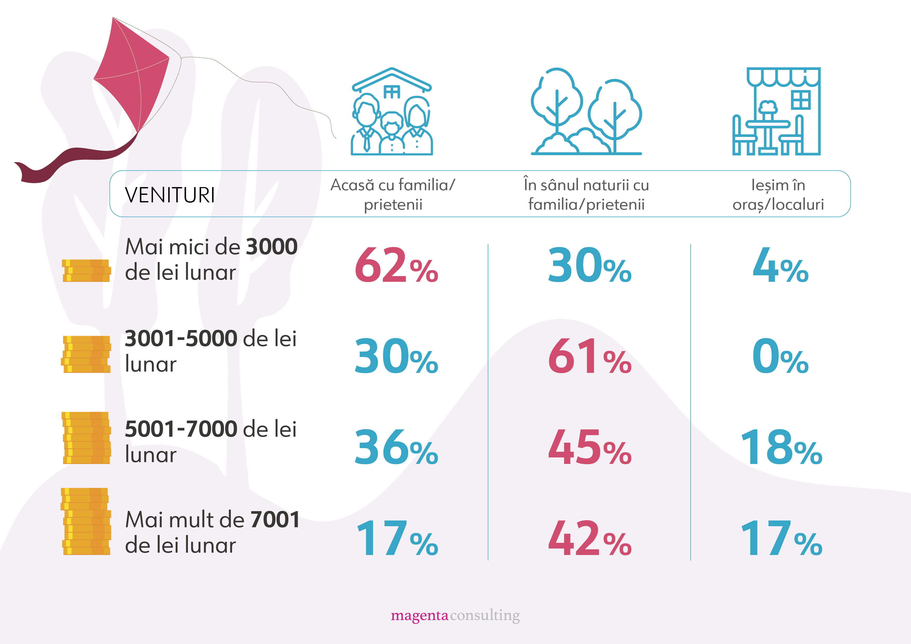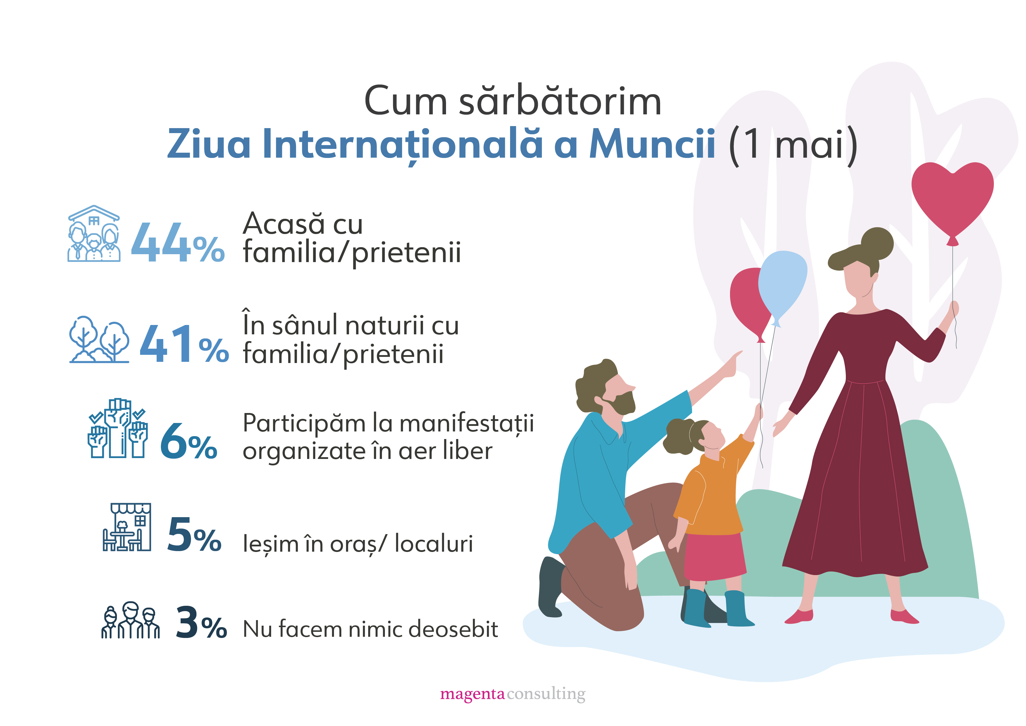 Tinerii obișnuiesc să iasă la natură de Ziua Muncii într-o măsură mai mare decât alte categorii de vârstă – 47% dintre cei cu vârsta de 18-25 de ani planifică un grătar în aer liber. Bărbații, de asemenea, preferă să petreacă această zi mai pe afară, pe când mai multe dintre femei au menționat că sărbătoresc 1 mai acasă. 61% dintre persoanele din mediul rural, de asemenea, aleg să sărbătorească acasă.
