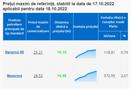 Astfel, benzina A95 va costa în următoarea zi cel mult 25 de lei și 10 bani per litru (cu 10 bani mai mult decât azi). Motorina se scumpește cu 58 bani și va avea un preț maxim de 28 de lei și 53 bani per litru.